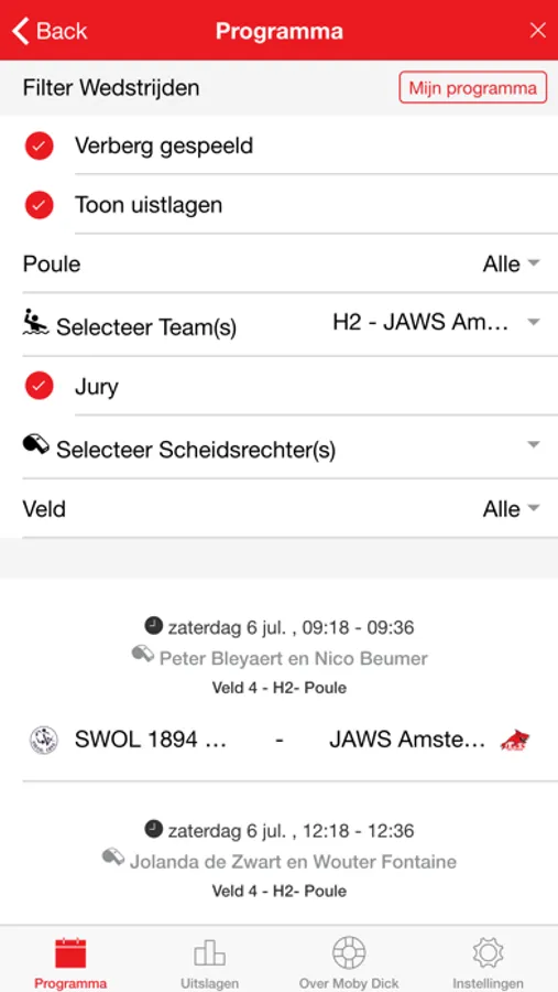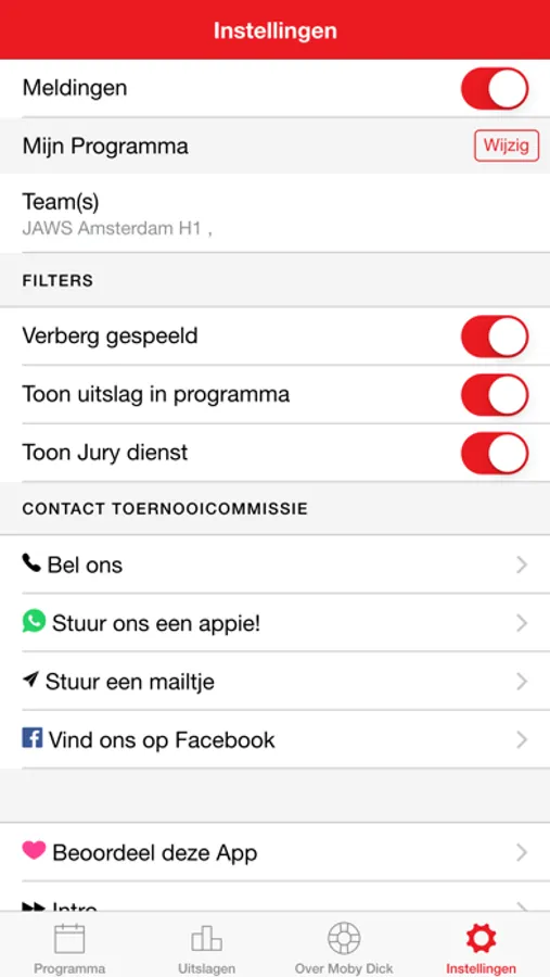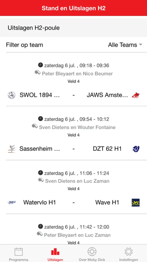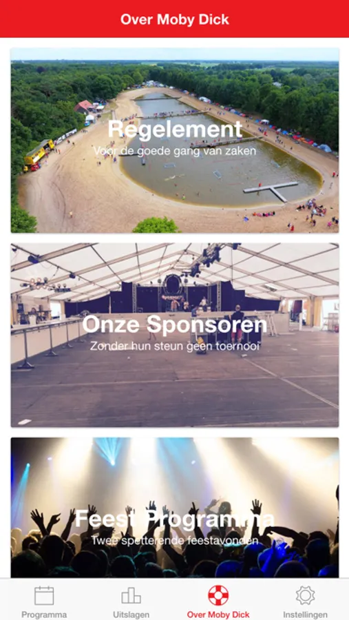 Met de Applicatie voor het Moby Dick Toernooi weet je wanneer je moet spelen, wat de uitslagen zijn en kan je meldingen ontvangen voordat je wedstrijd begint. Ook is er meer informatie over het Toernooi te vinden zoals de faciliteiten en de sponsoren.