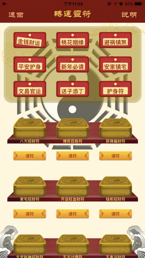 灵符的意义是天人之间沟通的一种信物,灵符大多以黄纸朱砂画之,因为黄色为五行之中庭,对应乾土坤土,为戊己中宫,代表镇摄十方,五行归附之意,黄色又为皇权至尊为用,代表了权威 正气。其次,朱砂为血红色,代表了丙丁之火,有除晦光明之意,再者,朱砂有辟瘟邪之药效。n无论是金钱财运,送子添丁,还是桃花姻缘,避祸镇煞,都可以在转运灵符app中求得自己想要的灵符。灵符可以守护你免于一切灾难,灵符可以给你带来财富、地位和名誉,灵符可以提升你所有的运势。