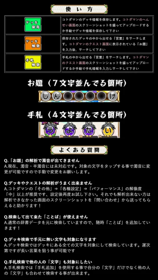 保存されたデッキの中から出せる「言葉」をサーチします。コトダマンのクエスト画面に表示されている「お題」を入力後、サーチして下さい
