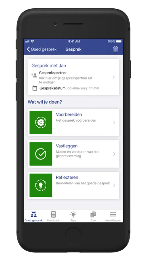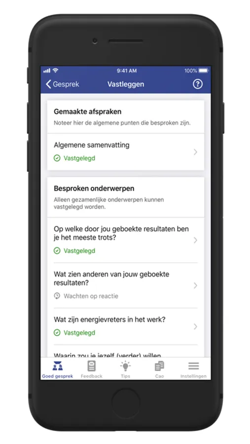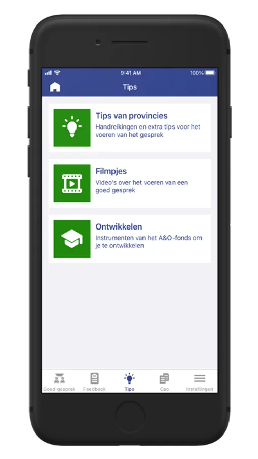 Deze app faciliteert medewerkers binnen de provinciale sector bij het voeren van het goede gesprek met tools, tips en informatie. In het onderdeel Gesprek kan je (in samenwerking met je gesprekspartner) een gesprek plannen, voorbereiden en vastleggen. Na afloop kan je het gesprek evalueren. In het onderdeel Feedback kan je feedback/feedforward vragen aan collega’s of derden. Naast deze tools bevat de app tips en extra informatie over het voeren van het goede gesprek. Ook zijn de cao-regelingen in de app beschikbaar.
