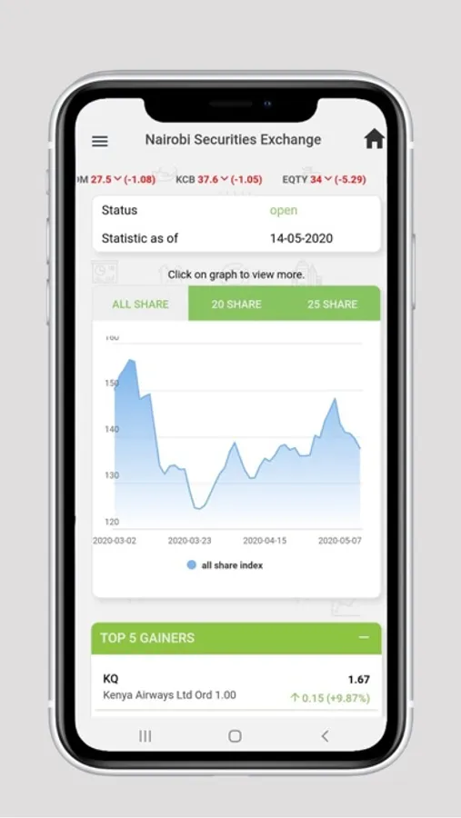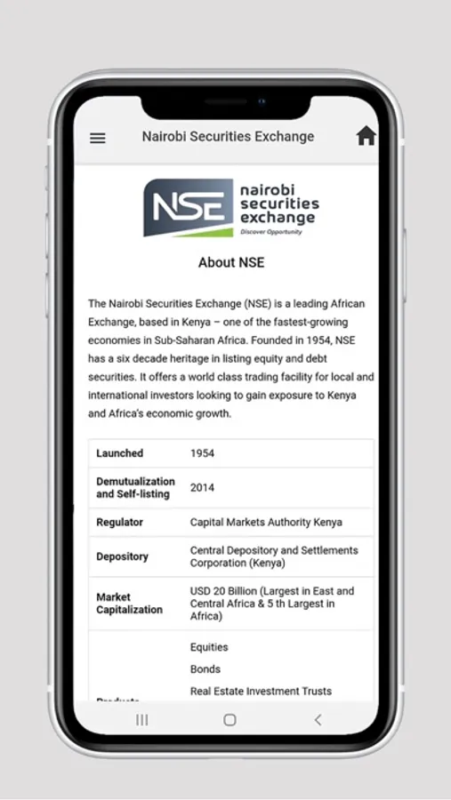 The new NSE app features the latest statistics about the Kenyan market. This app is your personal companion on the NSE. It's well suited for professionals who want to keep tabs with the NSE as well as new users who want to learn about the NSE and how to get involved.