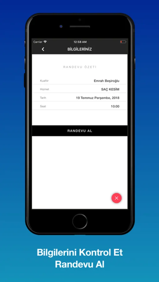 Bu uygulama ile çok kolay bir şekilde randevu alabilirsin. Tarih, saat, hizmet seçip telefon numaranı girdikten sonra randevun hazır!