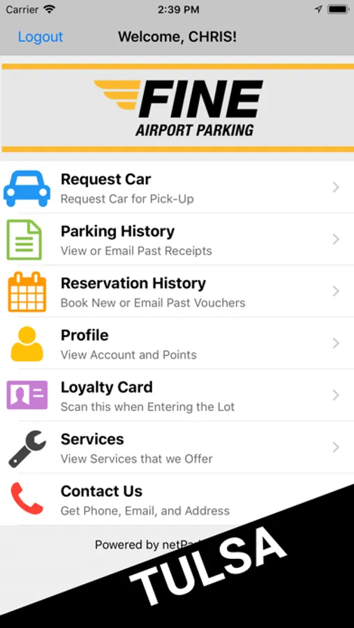 Customer portal for access to Fine Airport Parking located at Tulsa International Airport in Tulsa, OK, providing: