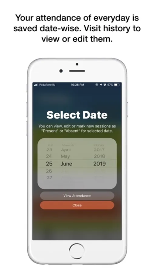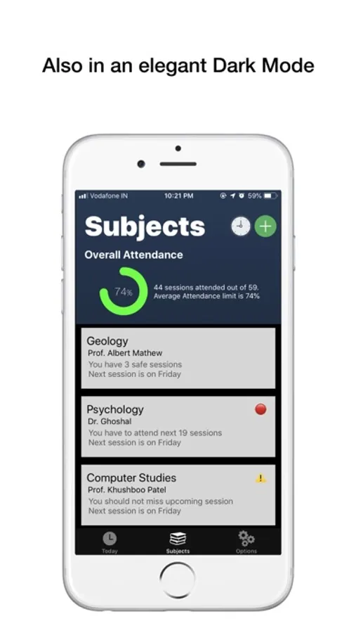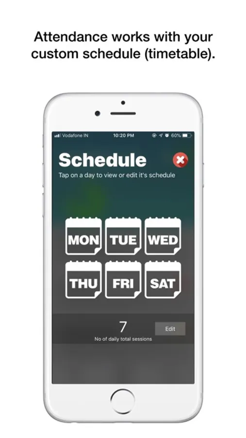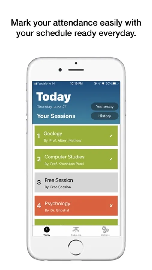 1. Setup your schedule (time-table) once, and you'll see your sessions according to that everyday on the "Today" tab to mark your attendance easily. Just swipe right to mark the session as "Present", left as "Absent" or partially swipe left and select "Class Canceled", if that's the choice. Else, just tap on a session and then select any of the three options.