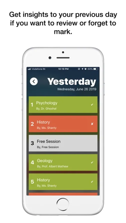 7. If you miss to mark attendance for some day, you can do it the next day by selecting "Yesterday" from the "Today" tab. This gives you a quick access to yesterday's schedule without looking up manually.