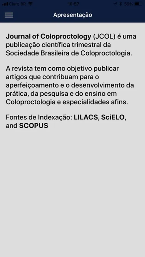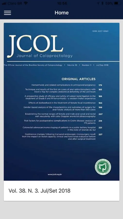 O Journal of Coloproctology é uma publicação trimestral da Sociedade Brasileira de Coloproctologia, com indexação em LILACS, SciELO e SCOPUS.