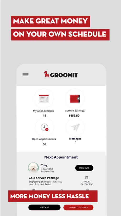 Join Groomit, the nations first in home pet grooming service. Apply on our website & once you’re approved, dog owners will send grooming requests your way. Do it full or part time, create your own schedule & you’ll get paid automatically into your bank account. Build your own customer business with Groomit. We provide you with grooming requests near you, supplies, insurance & team support. Don’t worry about anything.