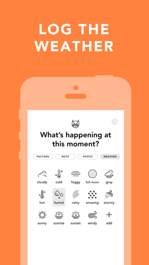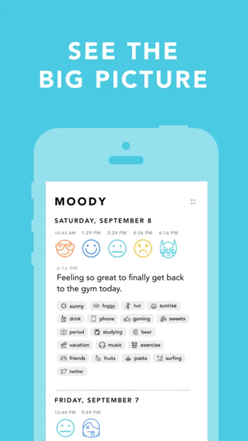 Log a mood and tag your activities, mood triggers, and even the weather. Add a note and/or a photo if you're so inclined. Moody makes journaling effortless.