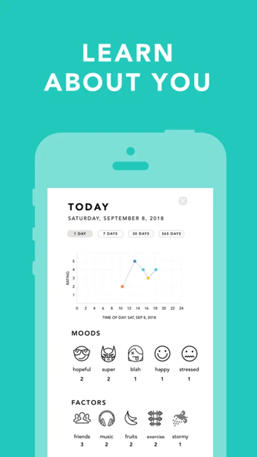 • A powerful STATS page will show you a tally of your moods, activities, weather, and a graph of your moods over time.