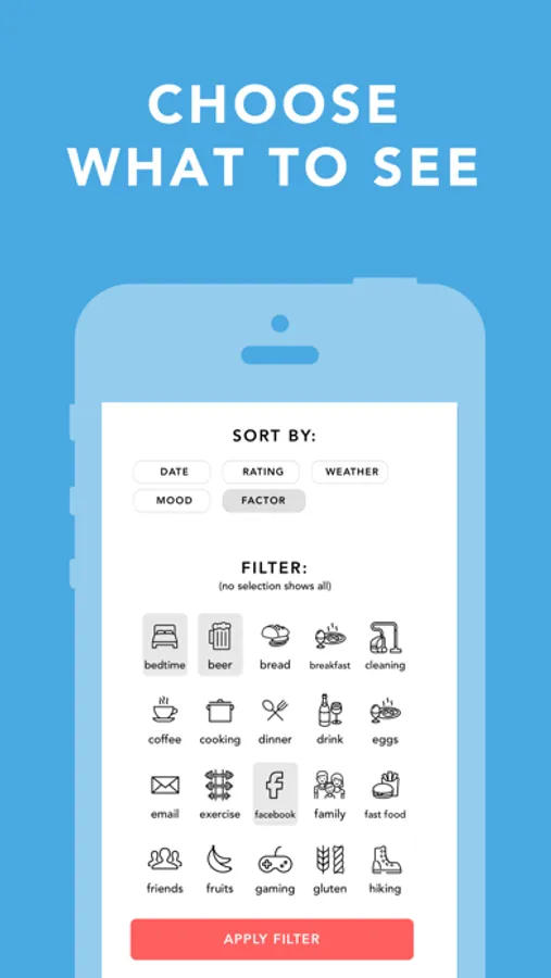 • A journal FILTER can show only entries with a certain mood, rating, weather, or activity.