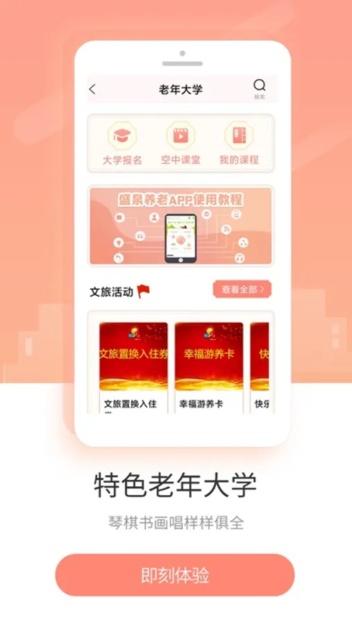盛泉养老APP,为中老年人提供涵盖居家养老,旅居养老,养老机构,老年大学,养老院,老年公寓,社区公益,敬老院等养老服务。利用线下二十多年来积累的专业服务经验与标准,关注老年人的生活、健康、安全、幸福,将孝爱文化传播人间,传承天下!
