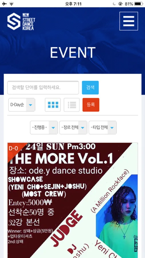 스트릿댄스 코리아 웹사이트에서는 이벤트를 기획하는 누구나 자신의 이벤트를 등록, 게시할 수 있습니다. 또한 변경사항이 있을 경우는 언제든지 수정도 가능합니다. 기존에 등장했던 앱의 경우 스스로 등록하는 시스템이 없어서 등록 문의를 하거나 기존에 올라와있는 내용을 수정해야하는 상황이 생겼을 때 확인 절차를 거쳐야만 최종적으로 등록이 되었는데 이러한 과정을 없앰으로써 시간 단축을 할 수 있게 되었습니다.