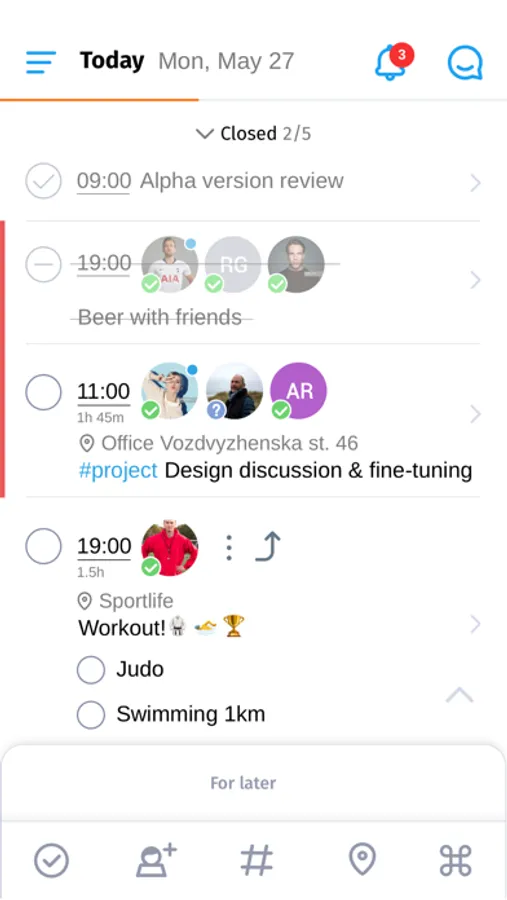 Minn allows you to easily plan your tasks, take notes and write down thoughts in your #diary; work on your #project; set up meetings with friends and discuss them in a messenger. All that in one place!