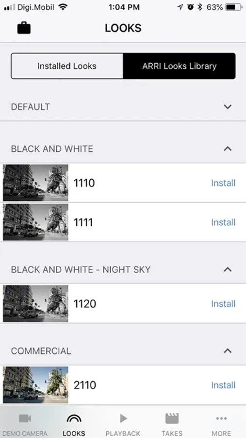 THE LOOKS MODULE allows for the entire ARRI LOOK LIBRARY to be browsed. If the connected camera has a valid ARRI LOOK LIBRARY license, those look can be installed directly from the app. If not, you can contact ARRI directly or purchase the ARRI LOOK LIBRARY here: https://alshop.arri.de/catalog