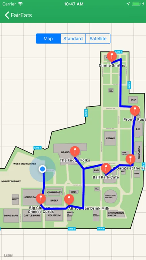 At the fair and craving cheese curds? Enable location tracking to see the number of steps to the nearest booth. Click on it and the map will guide you straight there.