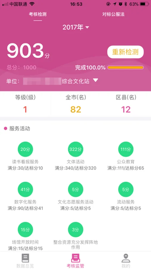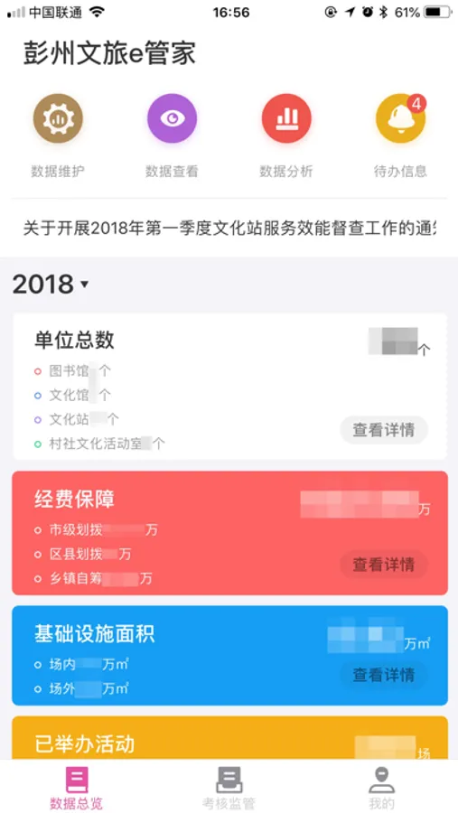 彭州文化e管家是"文化e管家"在我市的分平台,主要依托我市公共文化服务考核指标体系并利用大数据等技术,对辖区范围内各级公共文化服务单位进行在线考核和监管,同时按照市文广新局总体要求,及时全面的将相关数据对接进入文化e管家市级平台。目前该平台涉及市-乡镇-村社三个层级,被考核单位涵盖图书馆、文化馆、乡镇(街道)文化站、村社文化活动中心等,同时平台通过对原始数据和考核数据的分析,为各级用户提供工作优化建议,通过调查问卷等为了解群众真实需求提供能力和渠道支撑。最终为我市提高公共文化服务效能提供了强有力的平台保障!