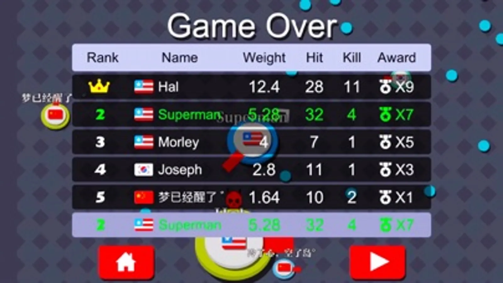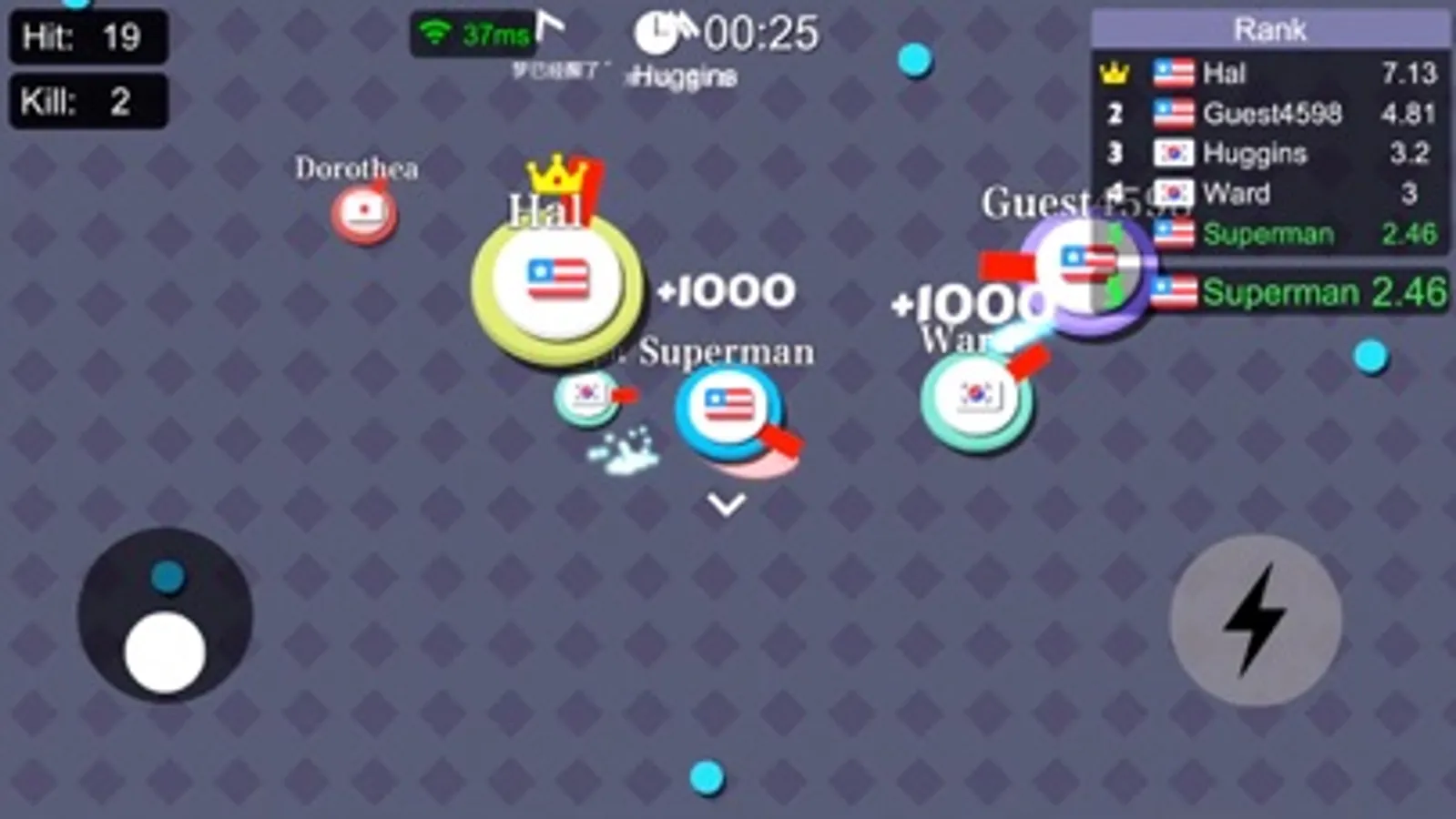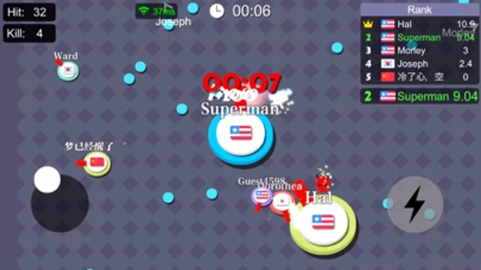 1. Control the motion by virtual control lever, defeat your opponents with your rotating arm.