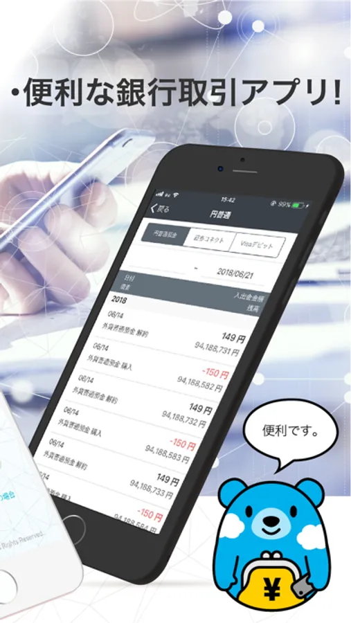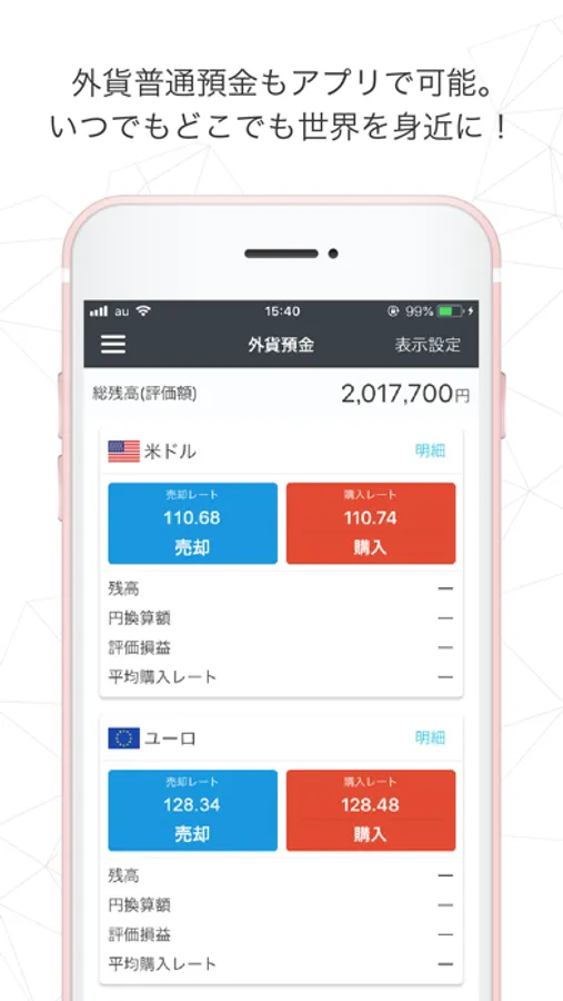 外貨の購入(預入)、売却もアプリで簡単に行えます。定番の通貨から好金利が魅力の通貨まで幅広くお取引いただけます。