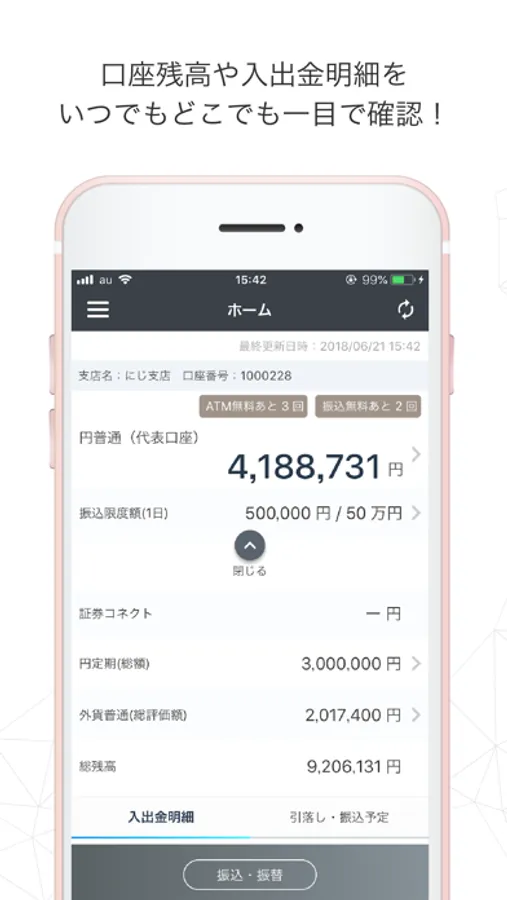 口座の残高と入出金明細がホーム画面で一目で確認できます。