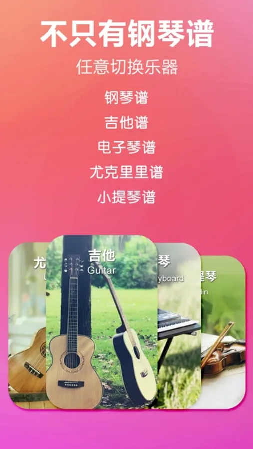 无论是钢琴,电子琴,还是吉他,尤克里里,小提琴,来弹琴吧 一键找谱,快速弹奏。