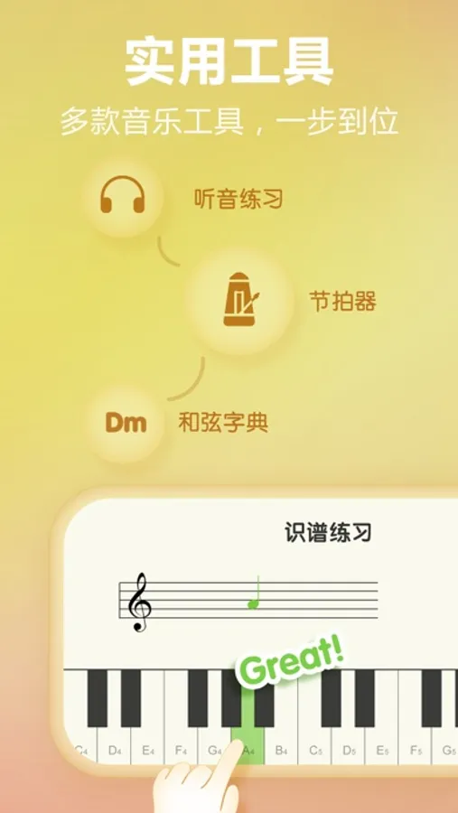 趣味小游戏帮你熟悉识谱听音,练习和弦,采用闯关模式,挑战力十足根本停不下来!