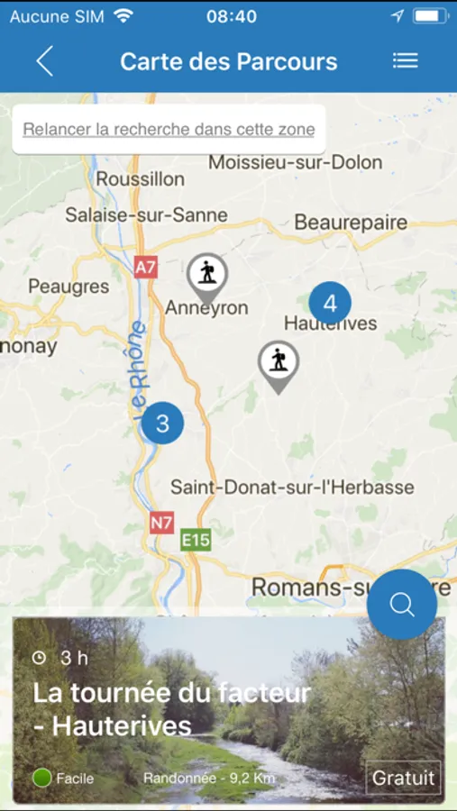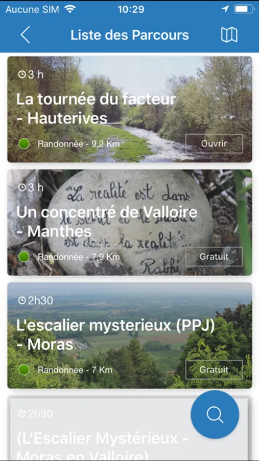 Grâce à la géolocalisation, l’ensemble des itinéraires à proximité de l’utilisateur s’affiche sur une cartographie. Il suffit alors de télécharger le circuit sélectionné et de se laisser guider !