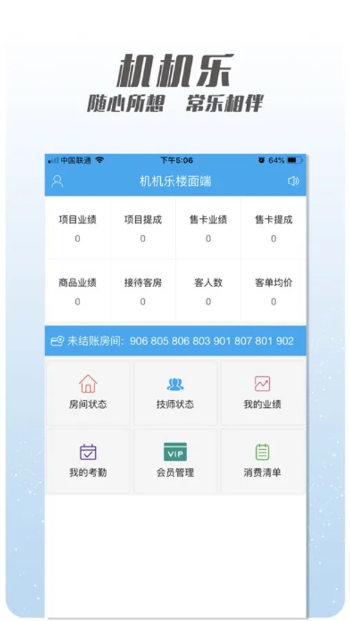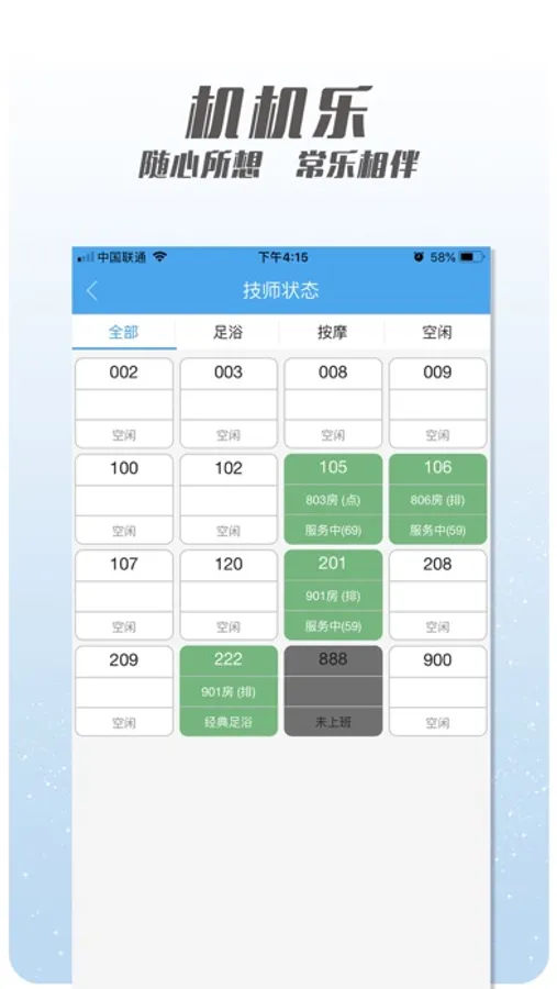 这是一款足浴按摩行业员工们用来查看自己各阶段的详细业绩和自己每天上下班考勤,帮助客人查询会员消费和充值记录,查询店内房间状态和技师状态的软件,同时可帮助客人点排技师,钟房查询技师牌位。