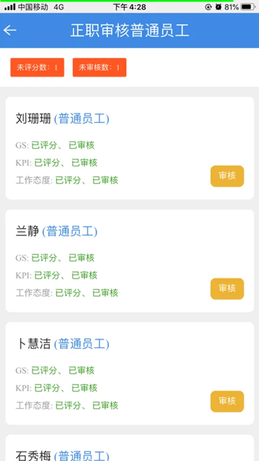 支持中层管理人员对主管部门副职、职员、班组的打分功能,支持中层管理人员对主管部门普通员工考核结果的审核功能。
