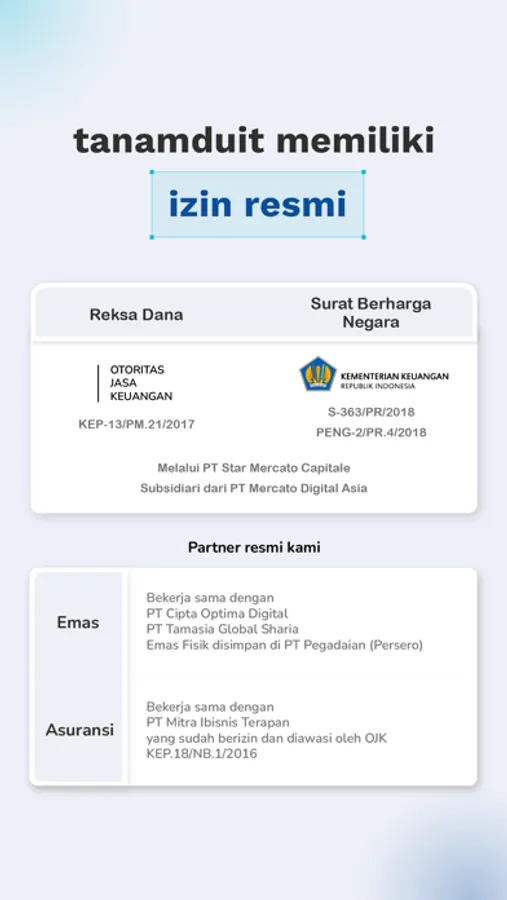 tanamduit memiliki lisensi sebagai APERD dari OJK dan menjadi Midis SBN resmi dari Kementerian Keuangan Republik Indonesia. Login aplikasi aman tanpa ribet dengan sistem autentikasi biometrik.