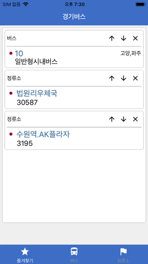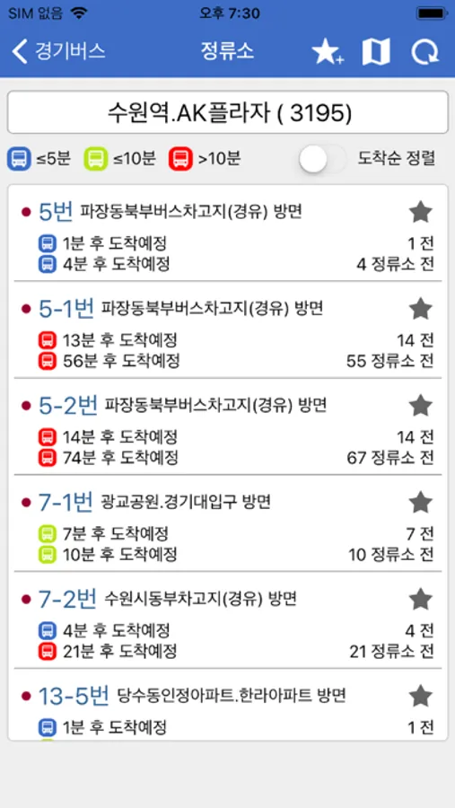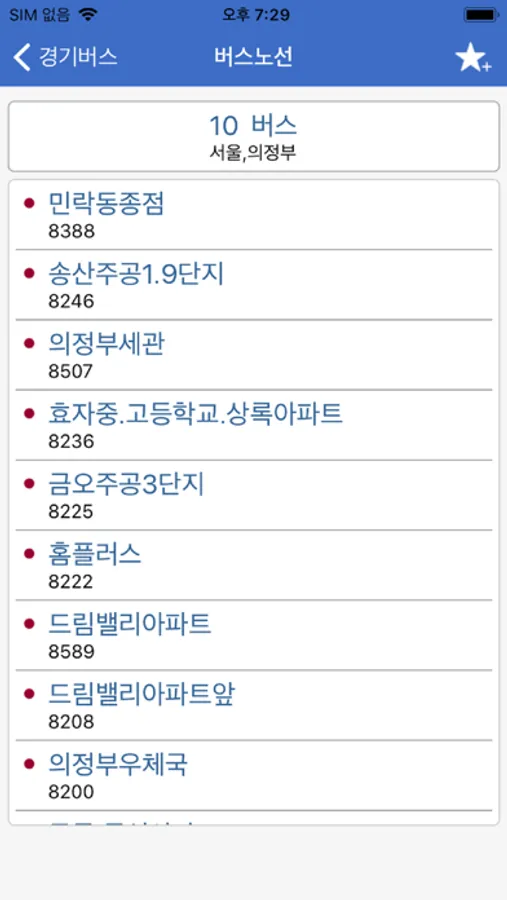 - 선호버스(별표)를 선택하면 선호버스는 항상 상위에 표시됩니다.
