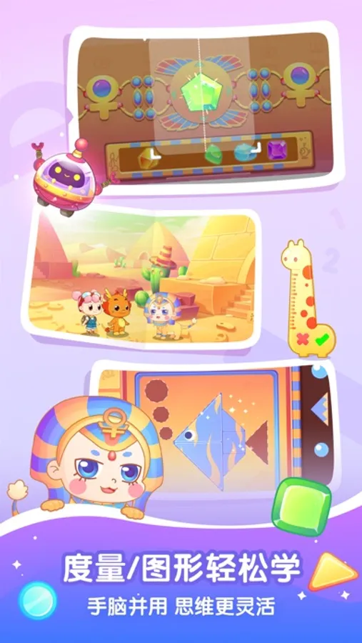 每天十分钟,孩子可通过趣味动画的引导,自主探索学习。每个关卡以数学为核心,融合科学、文化、历史、自然等多种元素,不止数学,也见世界。