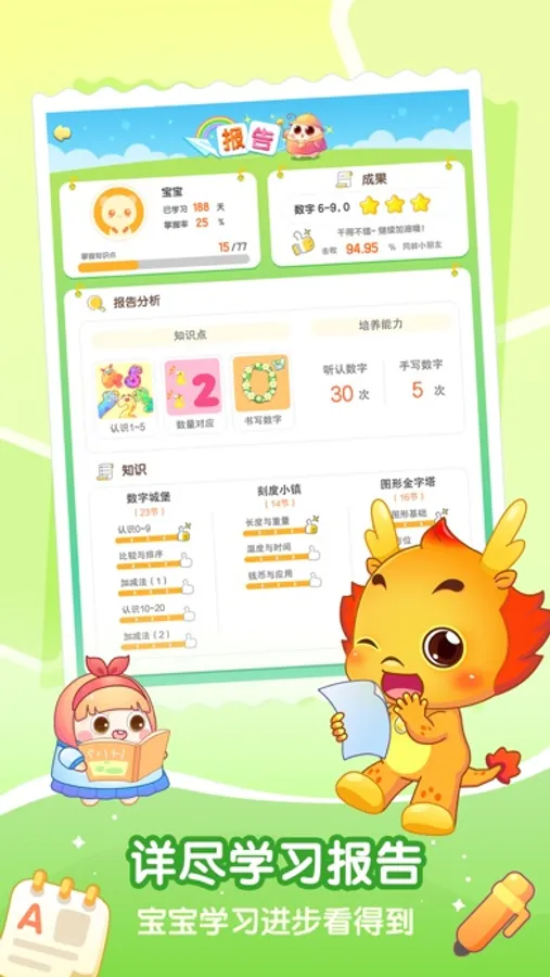 【小伴龙玩数学】根据儿童学习与发展指南设计的数学启蒙产品,为孩子们提供思维逻辑启蒙和智力开发的数字内容,采用孩子们喜欢的游戏化故事场景,轻松学习“数字与运算”、“刻度与重量“、“图形与空间》、“观察与推理”,综合启发孩子全项思维能力。