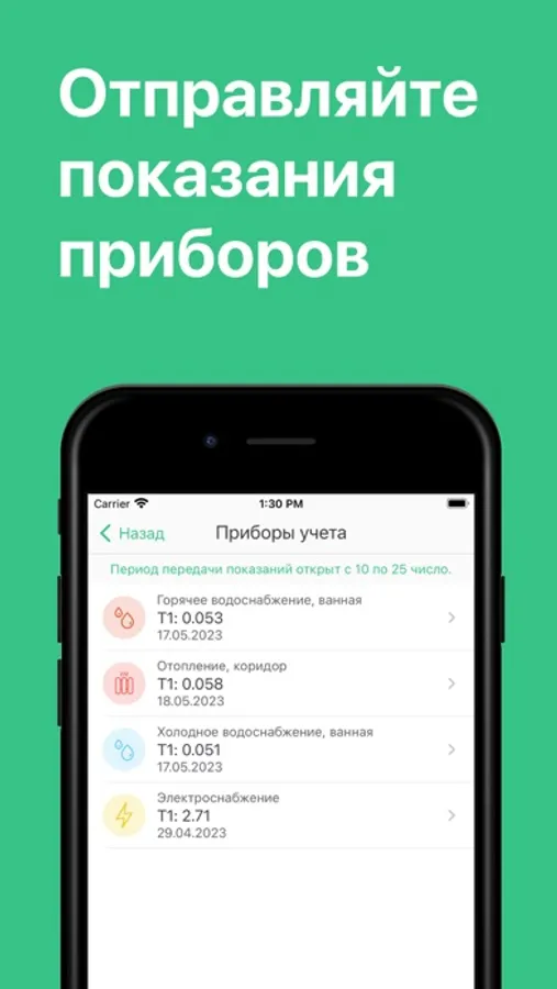 Все индивидуальных приборы учета выводятся в приложении, можно передать показания за текущий месяц и посмотреть историю.