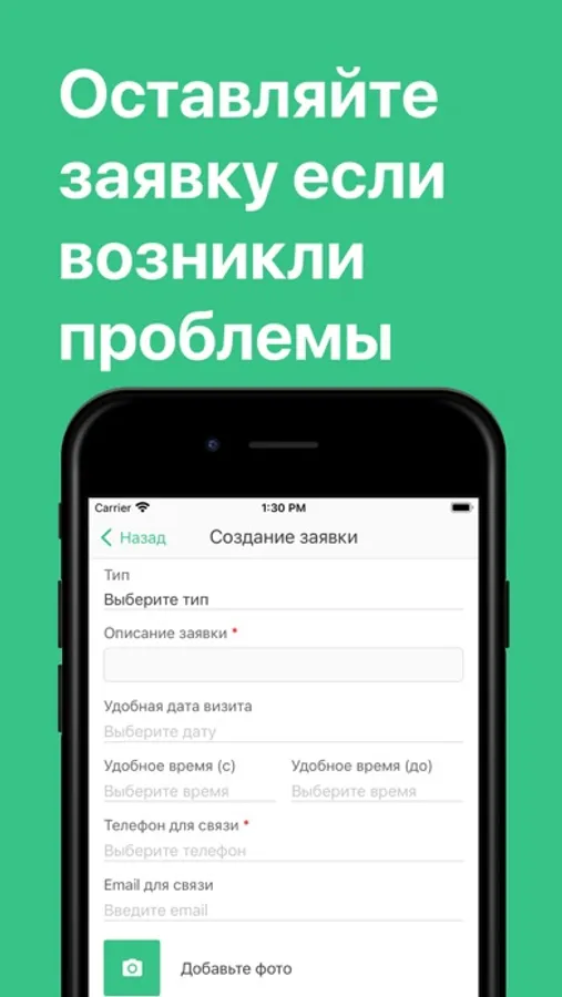Создайте заявку на конкретную дату и время, прикрепите к ней фото и комментарий, следите за ее выполнением и оцените качество выполнения.