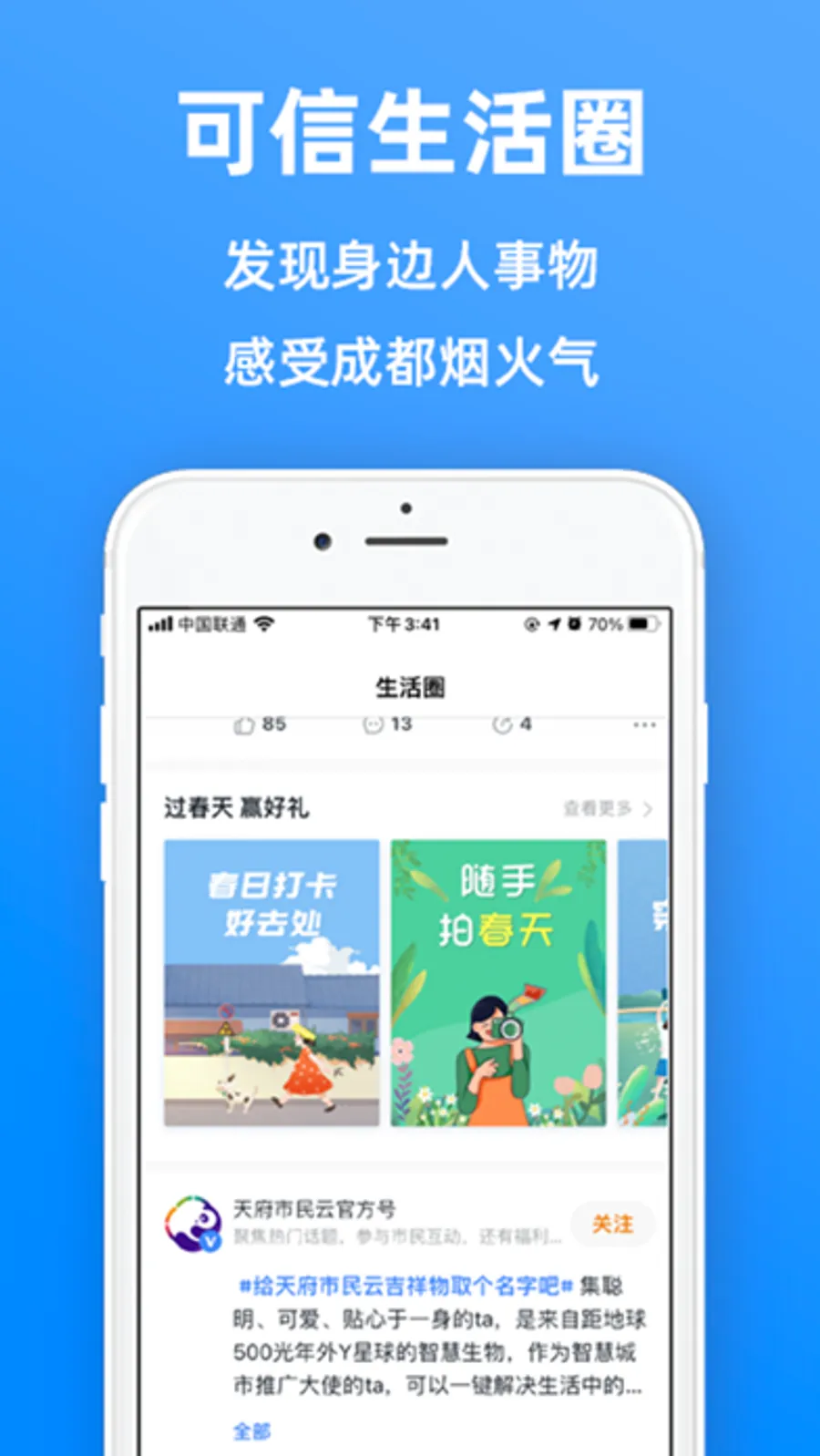 天府市民云是面向成都市民的一站式“互联网+”城市服务平台,能够实现一号通行和一号通办。天府市民云,为用户提供文体教育、民生保障、就业创业、家庭生活、交通旅游、健康医疗、环境气象等全生命周期服务。