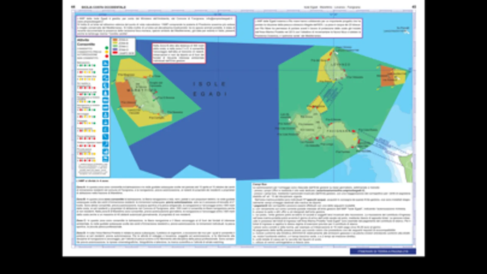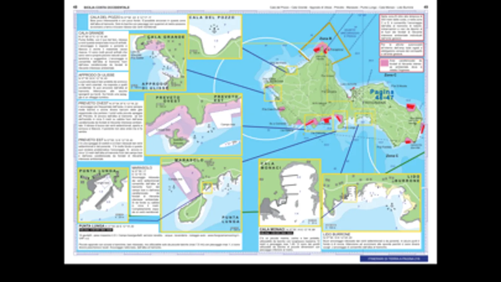 ANCHORAGE AREAS: are described, from those suitable for a brief swimming stop to those that provide good shelter in case of bad weather or to safely anchor overnight. Type of shelter, depths, rocks and the type of bottom are all indicated, together with the prevailing winds and currents, and suggestions regarding points of interest and the landscape.