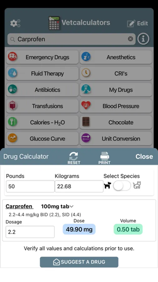 • Popup Drug Dose Calculator with ~200 veterinary drugs included