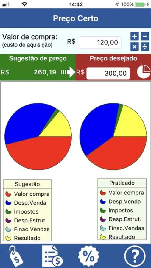 Com o Preço Certo você conseguirá calcular o preço de venda que deverá ser praticado sobre um determinado produto (ou serviço) de modo que você obtenha o resultado desejado (lucro).