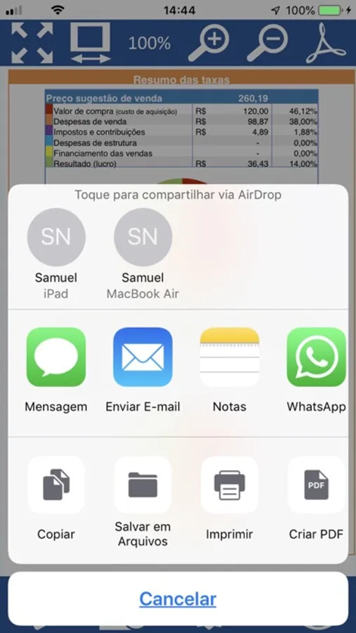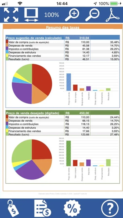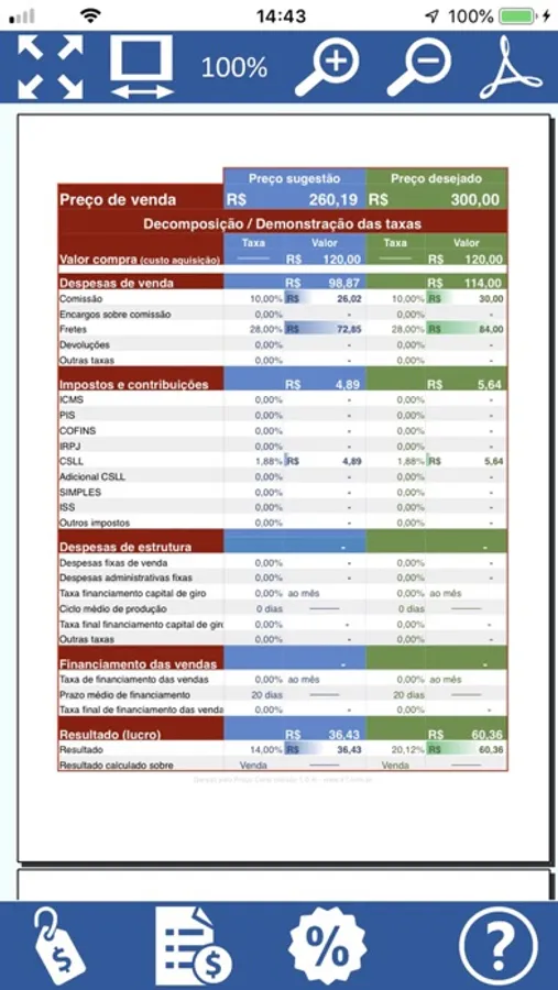 Será exibido um demonstrativo completo das taxas incidentes sobre o preço de venda sugerido e sobre o preço de venda praticado. Esse demonstrativo, poderá ser exportado em PDF e enviado por e-mail, compartilhado com outras aplicações, outros usuários, etc.