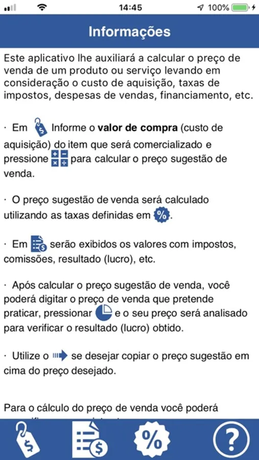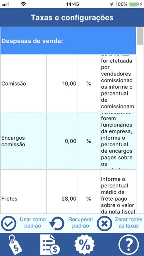 - Se as taxas informadas estiverem incorretas, o preço calculado poderá não oferecer a rentabilidade esperada ou, ainda, trazer prejuízos para você.