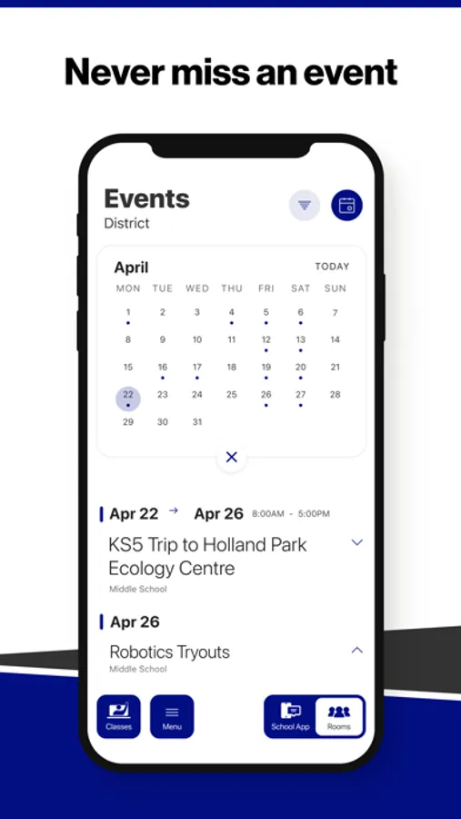 The event section shows a list of events throughout the district. Users can add an event to your calendar to share the event with friends and family with one tap.
