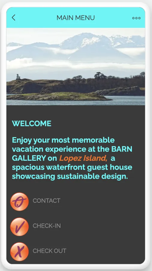 The BARN GALLERY, a spacious waterfront guest house showcasing sustainable design, guarantees a memorable vacation experience on Lopez Island in the unique San Juan Islands. This App provides a Digital Welcome Manual detailing everything guests will need to know before and during their stay at the BARN GALLERY. From check-in to check-out, with tips on how to operate state of the art appliances, lighting controls, gadgets and much more. The icing on the cake is our curated selection of local island information to help you create your most memorable vacation experience!