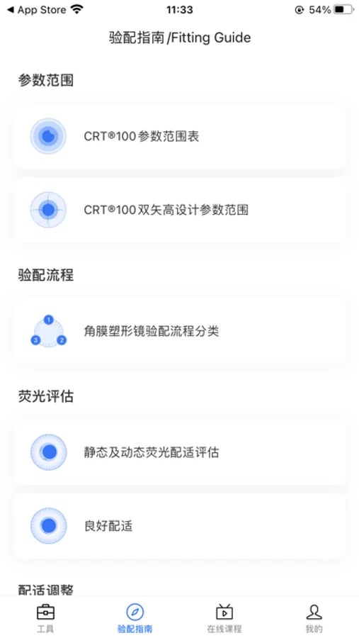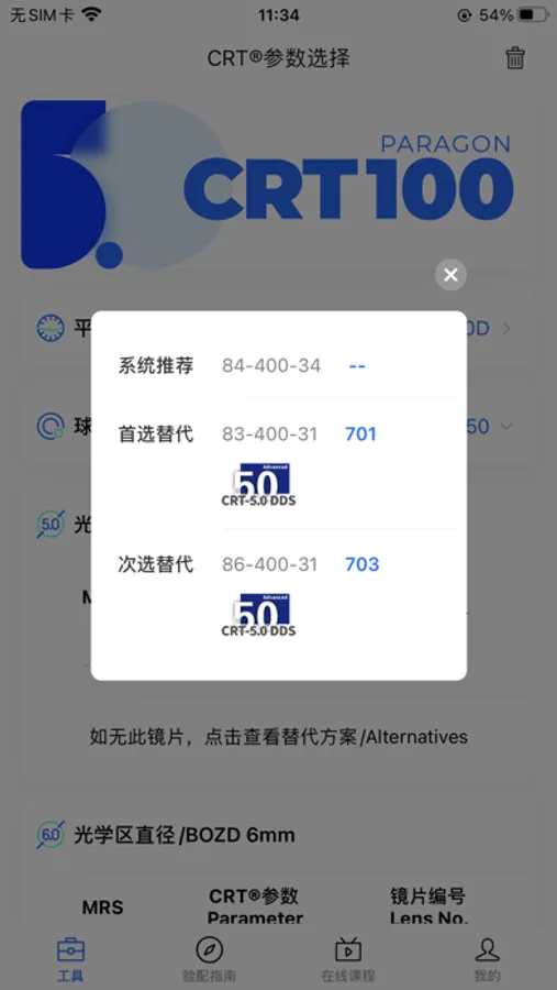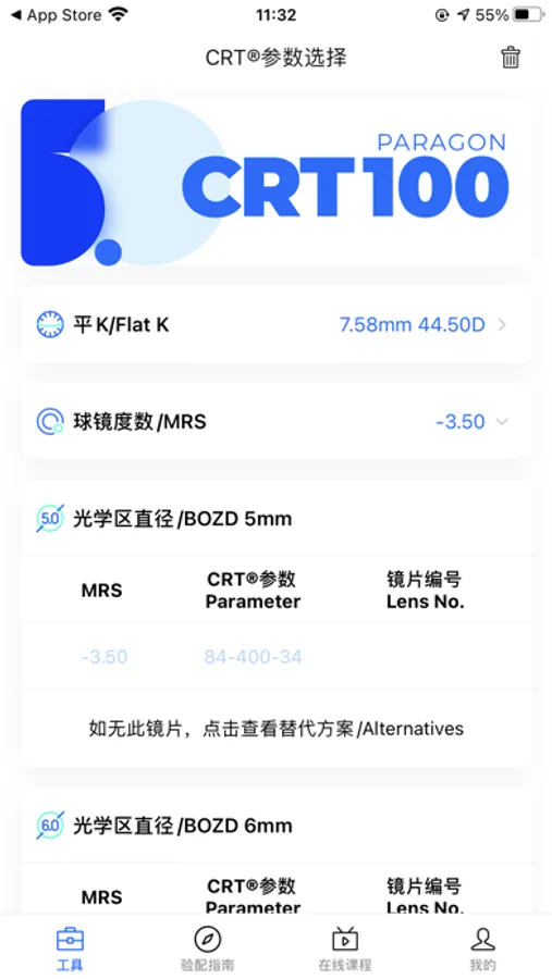 Paragon CRT® 100塑形镜为逆几何设计,与角膜形状有特定差异,使角膜暂时可逆的变形,以有效改变眼对光线的汇聚能力,进而正确聚焦。 摘镜后一段时间内,角膜仍旧可以维持其塑形后的形状。由于塑形效果为暂时性,需要进行维持戴镜以保证角膜的塑形效果,否则角膜将恢复到配戴前的水平。 本软件用于协助CRT镜片验配参数选择,并提供CRT镜片验配所需的核心线上专业资料及课程。