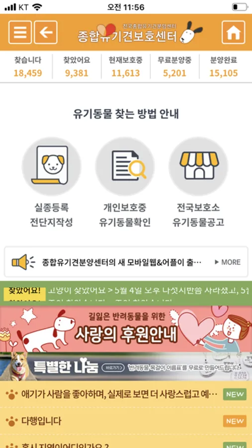 - 종합유기견보호센터에서는 빠른 유기견찾기와 분양, 많은 유기견 살리기를 위하여 이용하기 쉬운 새로운 어플을 출시하였습니다.