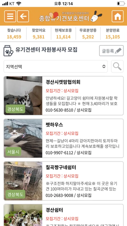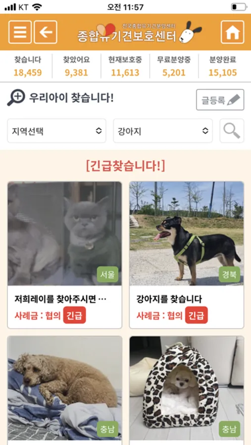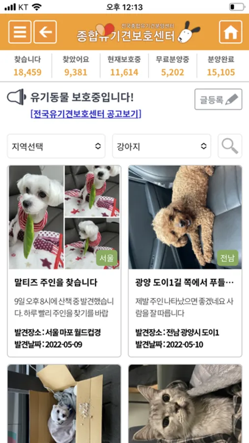 종합유기견보호센터의 전국 실종동물 긴급찾기프로젝트!