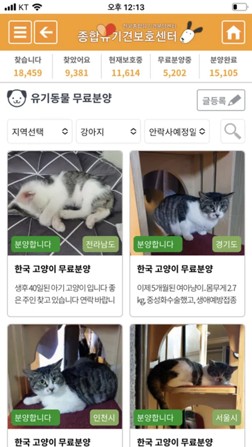 - 정부기관 동물보호관리시스템 및 지역 유기동물보호소 및 유기동물보호센터
