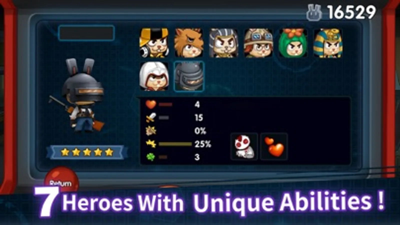 * 7 unique heroes with unique abilities.