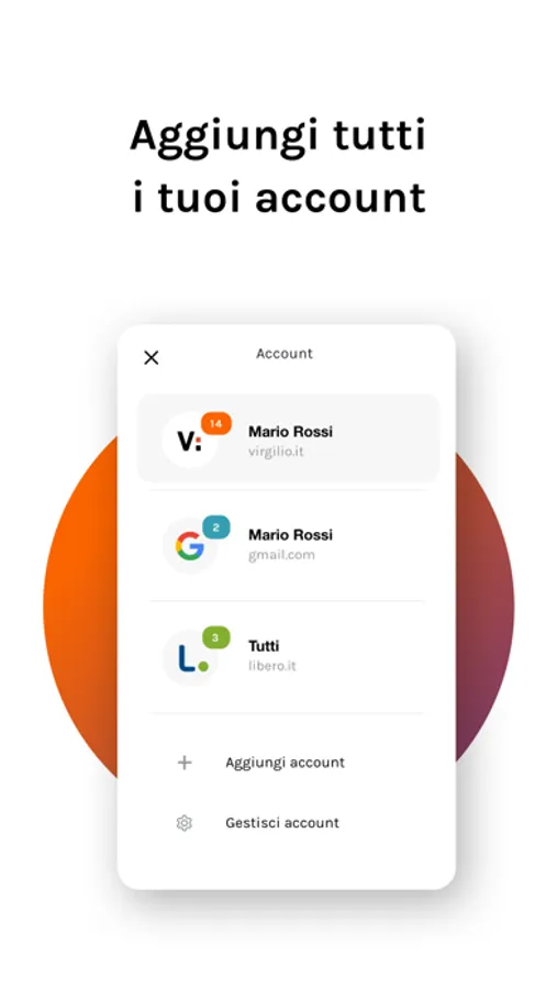 Aggiungi tutti i tuoi account di posta, di qualsiasi provider (Gmail, Yahoo, Hotmail) per avere tutte le tue mail in un’unica applicazione. Puoi usare Virgilio Mail app anche se non possiedi un account Virgilio.