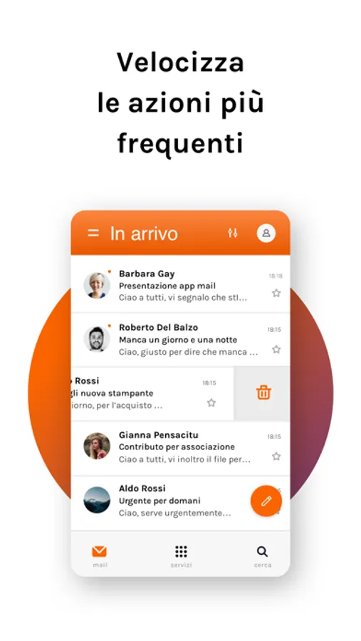 Utilizza la modalità a scorrimento per rendere più facili le azioni che compi più frequentemente: eliminare le mail, segnarle come lette o non lette, spostarle nelle cartelle, etichettarle come spam. Le azioni sono personalizzabili e puoi modificarle a tua scelta in qualsiasi momento