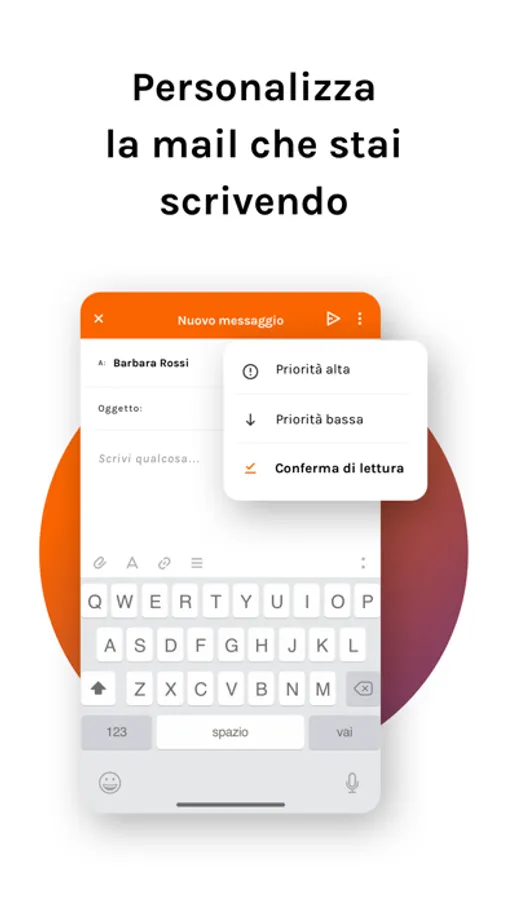 Consenti l’accesso alla rubrica del telefono per attivare la funzionalità di suggerimento dei destinatari quando stai scrivendo una mail. Abbiamo anche inserito un comodo pulsante “+” posizionato accanto al destinatario della mail che stai scrivendo per permetterti di accedere in modo rapido e veloce ai contatti della tua rubrica